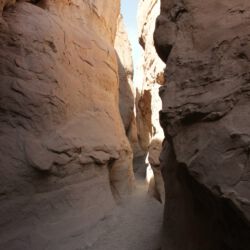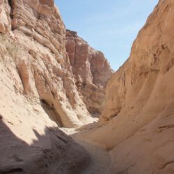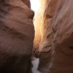 Wir nutzen unseren Allradantrieb und fahren steil bergab auf einer Piste zum Calcite Slot Canyon. Ruhe pur. Wir sind allein und da keine Wolke am Himmel ist, können wir in aller Ruhe den engen, ausgetrockneten Flusslauf erkunden. Bei Regen ist man besser woanders.